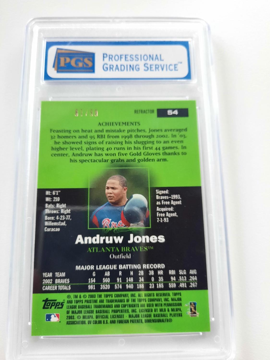 The 2003 Topps Pristine baseball set is known for its stunning design and high-quality cards. Among the most sought-after cards in the set is the Andruw Jones Refractor #54, which has been given a rare Gem Mint 10 grade by PGS Grading. Andruw Jones, also known as "The Curacao Kid," was a dominant center fielder for the Atlanta Braves in the early 2000s. He was a five-time All-Star and a Gold Glove winner, known for his incredible defensive skills and powerful swing. In 2003, Jones had one of his best seasons, hitting 36 home runs and leading the league in RBIs. The 2003 Topps Pristine Andruw Jones Refractor #54 card features a stunning design with a chrome and refractor finish. The card showcases Jones in his iconic Braves uniform, mid-swing, with the Atlanta skyline in the background. The refractor finish gives the card a shiny and reflective surface, making it a standout in any collection. What makes this specific card even more desirable is its Gem Mint 10 grade from PGS Grading. PGS, or Player Grading Service, is a well-respected third-party grading company that evaluates and grades sports cards based on their condition. A Gem Mint 10 rating is the highest grade a card can receive, indicating that it is in pristine condition with no flaws or imperfections. For collectors, a Gem Mint 10 graded card like the 2003 Topps Pristine Andruw Jones Refractor #54 holds a lot of value. With a perfect grade, this card can demand a premium price on the market. And because of Jones' status as a fan-favorite and all-time great player, this card is sure to be a prized possession for any Braves or Jones collector. In addition to its physical attributes and rarity, the 2003 Topps Pristine Andruw Jones Refractor #54 is also significant as it represents a pivotal time in Jones' career. 2003 was the year he solidified himself as one of the top players in the league, and this card captures that moment perfectly. In recent years, the sports card market has seen a surge in demand for high-grade, rare cards, making the 2003 Topps Pristine Andruw Jones Refractor #54 a highly sought-after card. Whether you're a fan of Jones, the Braves, or just collecting the best cards from the 2003 Topps Pristine set, this card is a must-have. So, if you come across the 2003 Topps Pristine Andruw Jones Refractor #54 graded Gem Mint 10 by PGS Grading, consider yourself lucky. It's a rare and valuable card that represents the best of baseball in the early 2000s and the excellence of one of the game's greatest players.