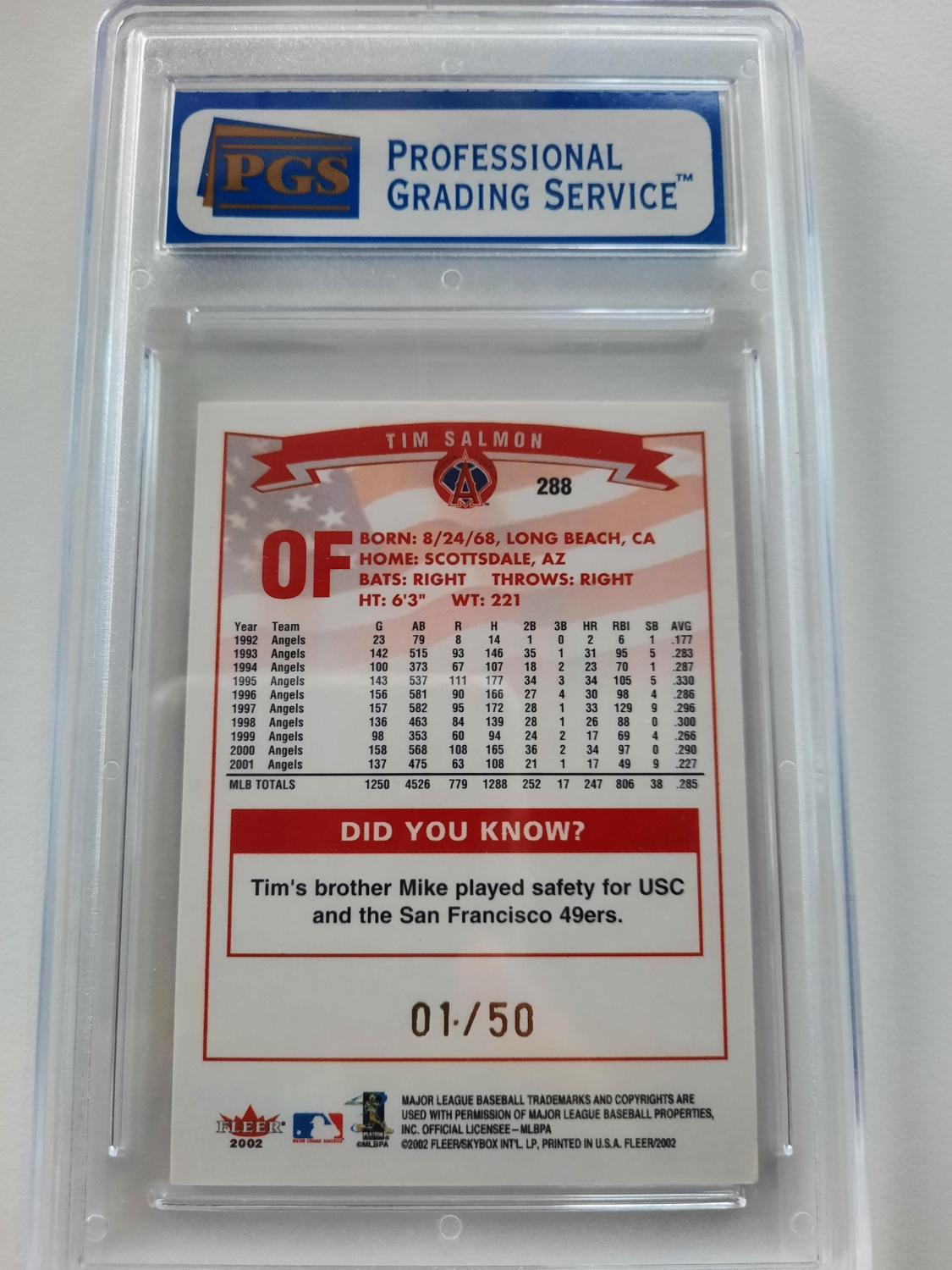 2002 Fleer Tim Salmon Mini 01/50 graded 8 by PGSGrading When it comes to rare collector's items, sports cards always rank high on the list. And within the world of sports cards, one name that stands out is Tim Salmon, the former outfielder and designated hitter for the Los Angeles Angels. In 2002, Fleer released a special edition card featuring Tim Salmon, but with a unique twist. It was a mini version, measuring only 2.5 inches by 3.5 inches, making it a highly sought-after item for collectors. Not only that, but this particular card was one of only 50 in existence, thus making it even more valuable. But what truly sets this card apart is its grade of 8 by PGSGrading, the leading grading company for sports cards. But what does this grade actually mean, and why is it important? Firstly, let's start with the grading process. PGSGrading assesses cards based on several factors such as centering, corners, surface, and edges. Each of these aspects is examined and given a grade on a scale of 1 to 10, with 10 being the highest score. The overall grade is then determined by taking the average of these individual grades. So, a grade of 8 for this Tim Salmon card means that it has received high marks in all of the key areas, indicating that the card is in excellent condition. This is crucial for collectors, as a higher grade translates to a higher value for the card. And in the world of sports cards, where the value of a card can vary greatly based on condition, a grade of 8 is considered to be near-mint, making it a highly desirable item for any collector. In addition to the rarity and grade, the design of this card also adds to its appeal. The mini version of the card features a striking image of Tim Salmon in his Angels uniform, with a gold border framing the card. The simplicity of the design allows for the focus to be on the player, making it a visually appealing piece for any collection. The 2002 Fleer Tim Salmon Mini 01/50 graded 8 by PGSGrading is not only a valuable item for collectors, but it also holds a special place in sports history. This was the last year that Fleer produced baseball cards, making this card a piece of nostalgia for fans of the hobby. And with only 50 of these cards in existence, it is a rare find and a true gem for any collection. Whether you are a die-hard fan of Tim Salmon or a passionate collector of sports cards, this uniquely graded card is a must-have. With its rarity, high grade, and iconic design, it is a testament to the enduring popularity of both Tim Salmon and the timeless appeal of collecting sports cards.