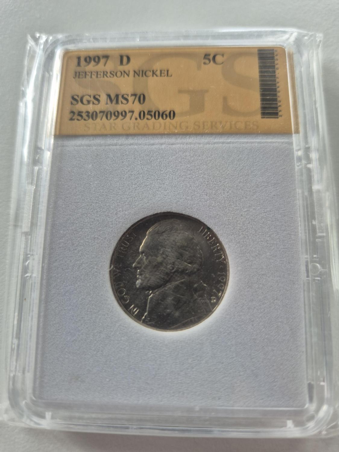 1997 D 5 Cent Coin American Graded MS70 by SGS