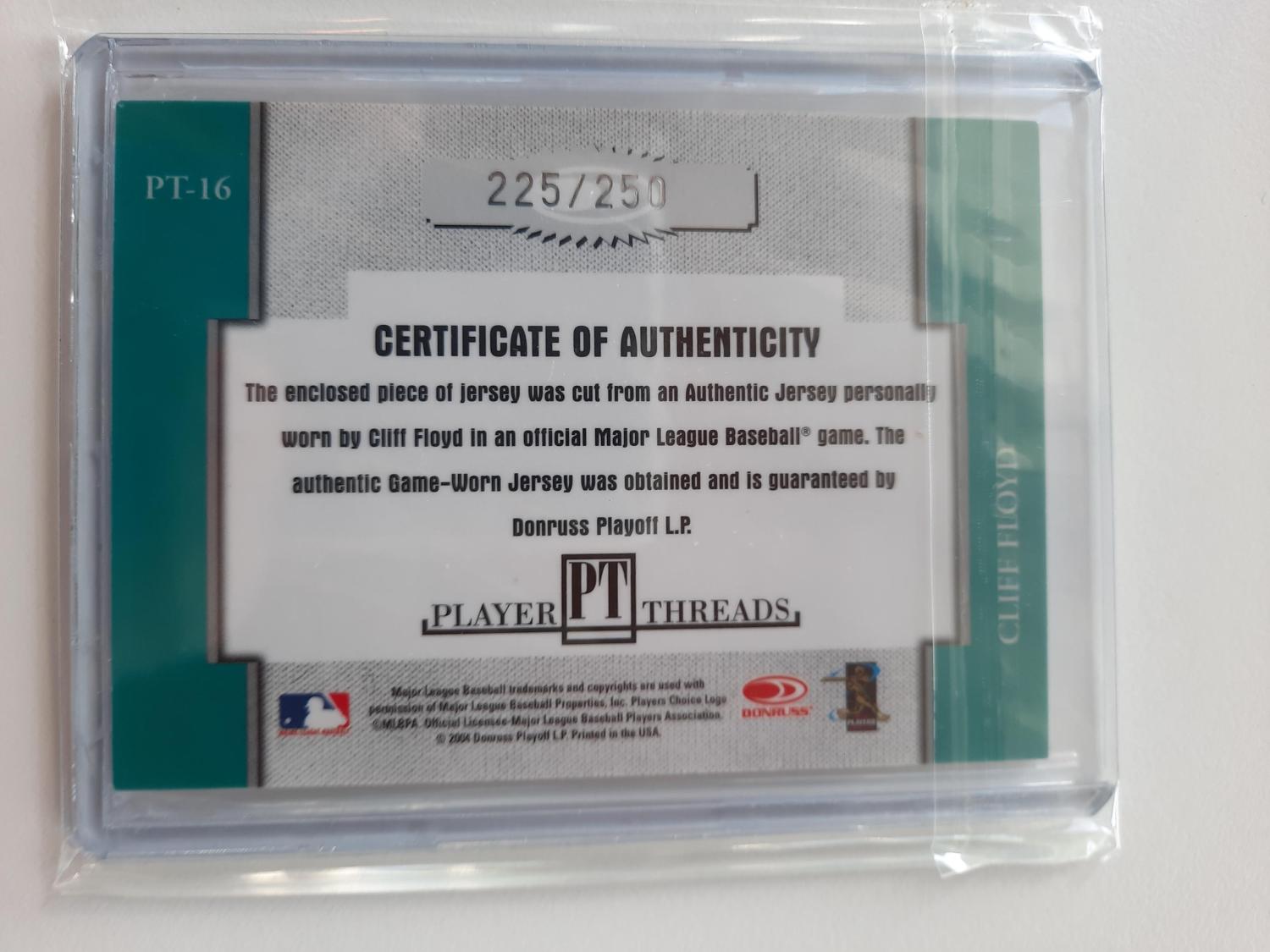 2004 Donruss PT-16 Cliff Floyd Game Worn Jersey 225/250: A Must-Have for Any Baseball Fan In the world of baseball card collecting, there are few things that excite collectors more than a game-worn memorabilia card. These cards not only hold significant value, but they also represent a piece of history from the sport that we all love. One such highly sought-after card is the 2004 Donruss PT-16 Cliff Floyd Game Worn Jersey 225/250. Cliff Floyd is known as one of the most talented and accomplished baseball players of his generation. The left-handed outfielder played for numerous teams throughout his career, including the Montreal Expos, Florida Marlins, New York Mets, and the Chicago Cubs. With over 1,400 career hits and 233 home runs, Floyd was a true powerhouse at the plate. He was also known for his defensive skills, making him a well-rounded player and a fan favorite. In 2004, Donruss, a well-respected name in the sports card industry, released their PT-16 set as part of their Prime Time series. This set featured game-worn jersey cards from some of the biggest names in baseball at the time. Each card was numbered to 250, making them highly collectible and sought after by fans and collectors alike. The 2004 Donruss PT-16 Cliff Floyd Game Worn Jersey card features a piece of Floyd's actual game-used jersey. The jersey swatch is prominently displayed on the front of the card, adding a unique and authentic touch to the overall design. The back of the card also includes a brief description of the game and the date the jersey was worn, creating a piece of tangible history for collectors to cherish. As is the case with all game-worn memorabilia cards, the scarcity of these cards adds to their value. With only 250 cards available in this particular set, the 2004 Donruss PT-16 Cliff Floyd Game Worn Jersey card is a must-have for any serious collector. Its limited availability and connection to one of the most talented players of the early 2000s make it a valuable addition to any collection. Not only is this card prized for its historical significance, but it is also highly coveted for its aesthetic appeal. The design of the card is visually appealing, with its sleek black and gold border and bold font. The placement of the jersey swatch on the front of the card makes it the focal point, drawing the eye immediately to the piece of game-used memorabilia. In today's sports card market, where there are countless options available for collectors, it's important to invest in cards that hold significant value and meaning. The 2004 Donruss PT-16 Cliff Floyd Game Worn Jersey 225/250 is one such card that checks all the boxes. Not only does it feature a highly-regarded player, but it also offers a tangible piece of history for fans to add to their collection. So, whether you're a die-hard Cliff Floyd fan or a serious baseball card collector, this card is a must-have and a true gem in the world of sports memorabilia.