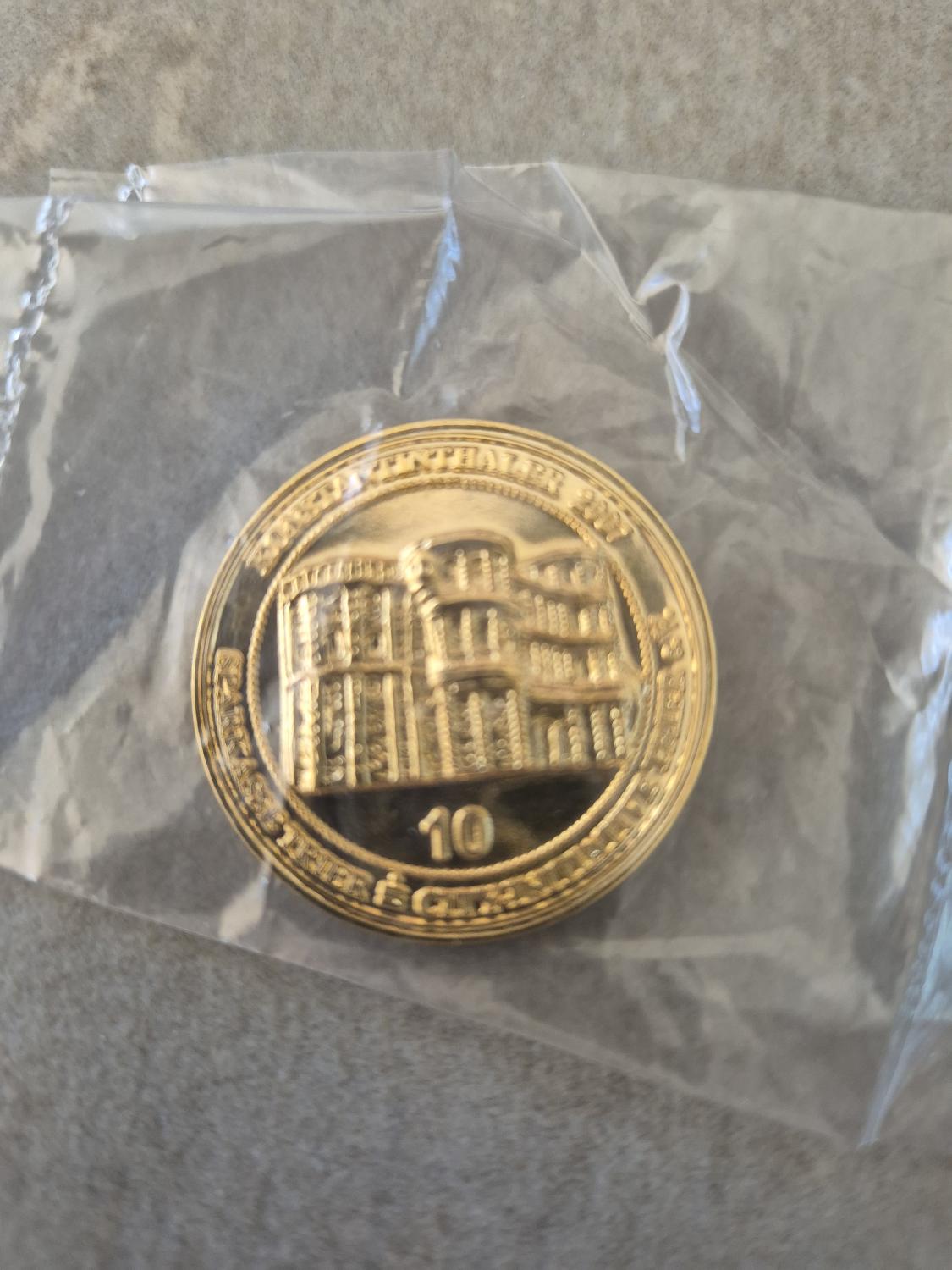 This image shows a gold coin featuring a Roman emperor. The coin is in excellent condition, with no visible scratches or damage. The emperor's face is clearly visible, and the coin's details are sharp and well-defined. The coin is likely a replica or a commemorative piece, as it is not a standard Roman coin. The coin is a beautiful example of Roman art and craftsmanship, and it would be a valuable addition to any coin collection.